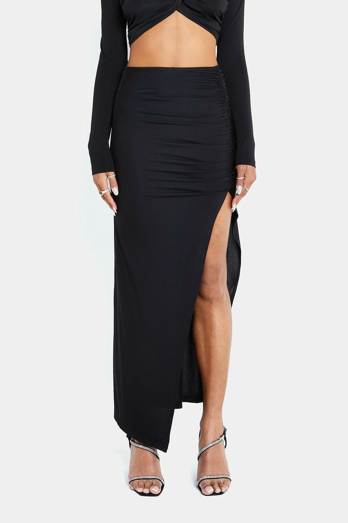 SOLADO High Waist Split Hem Ruched Bodycon Maxi Skirt
