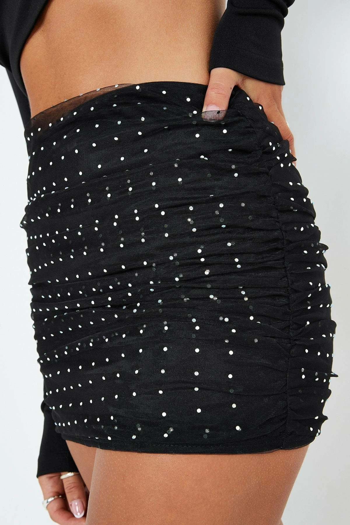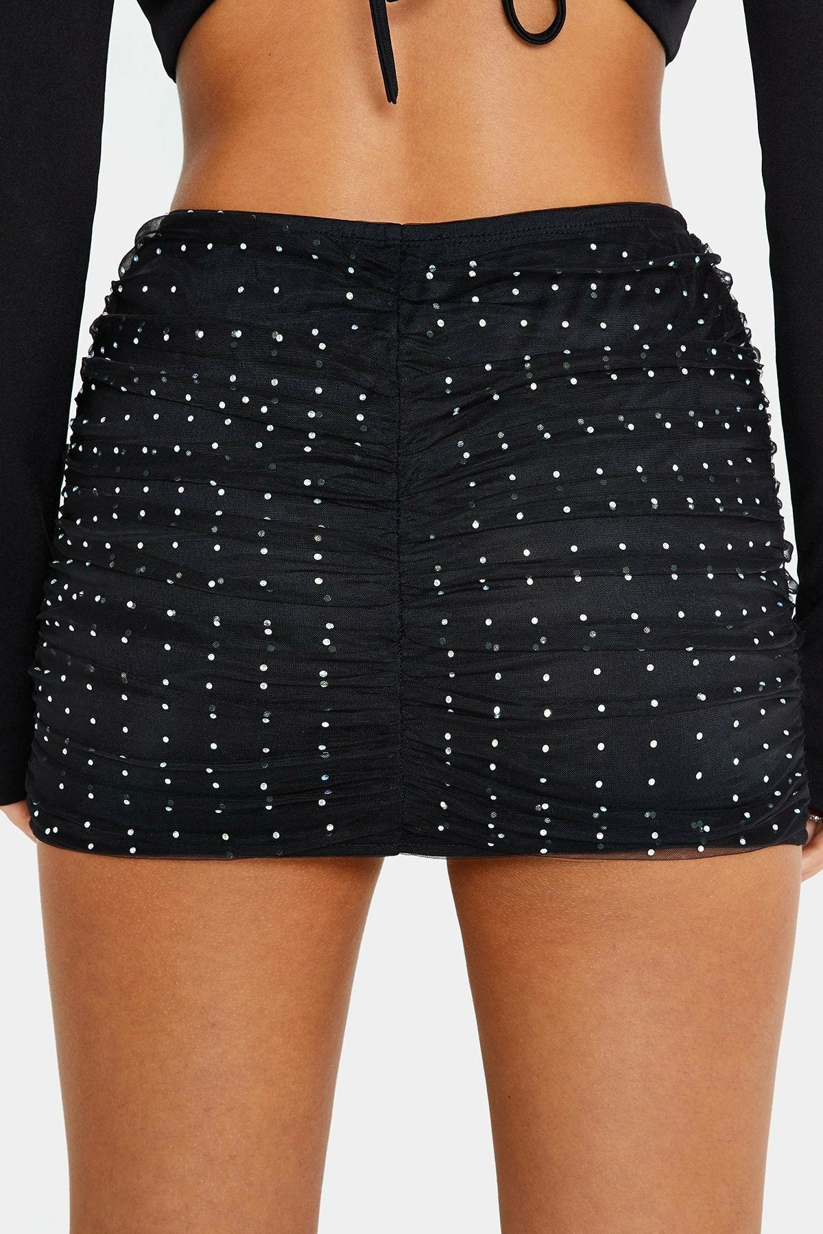 SOLADO Rhinestone Decor Mesh Ruched Mini Skirt