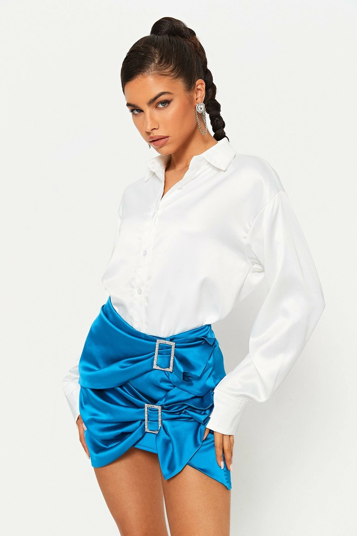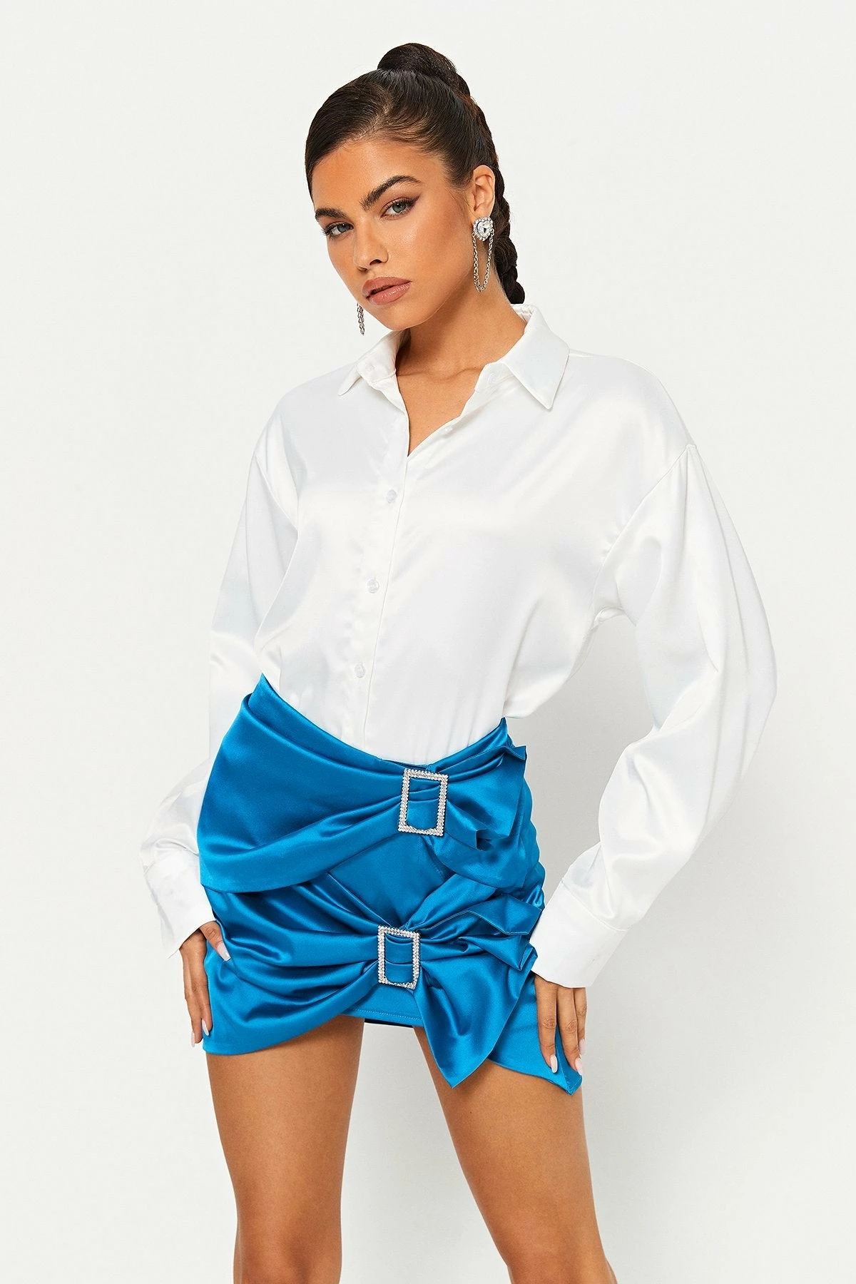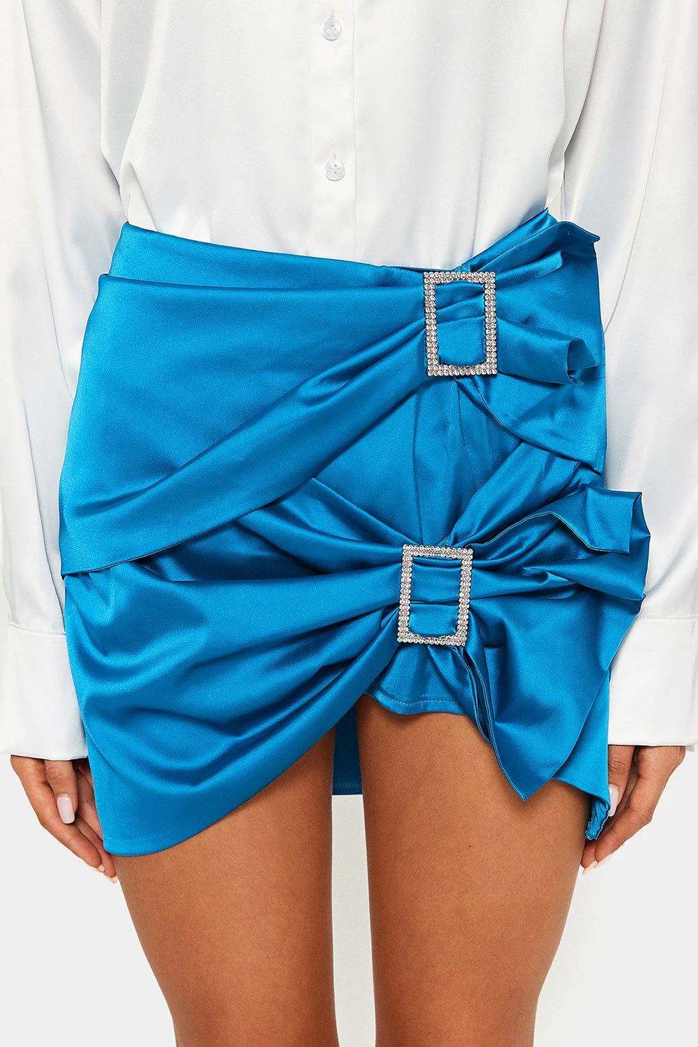 Be the first to review “SOLADO Satin Rhinestone Buckled Decor Ruched Mini Skirt” Cancel reply